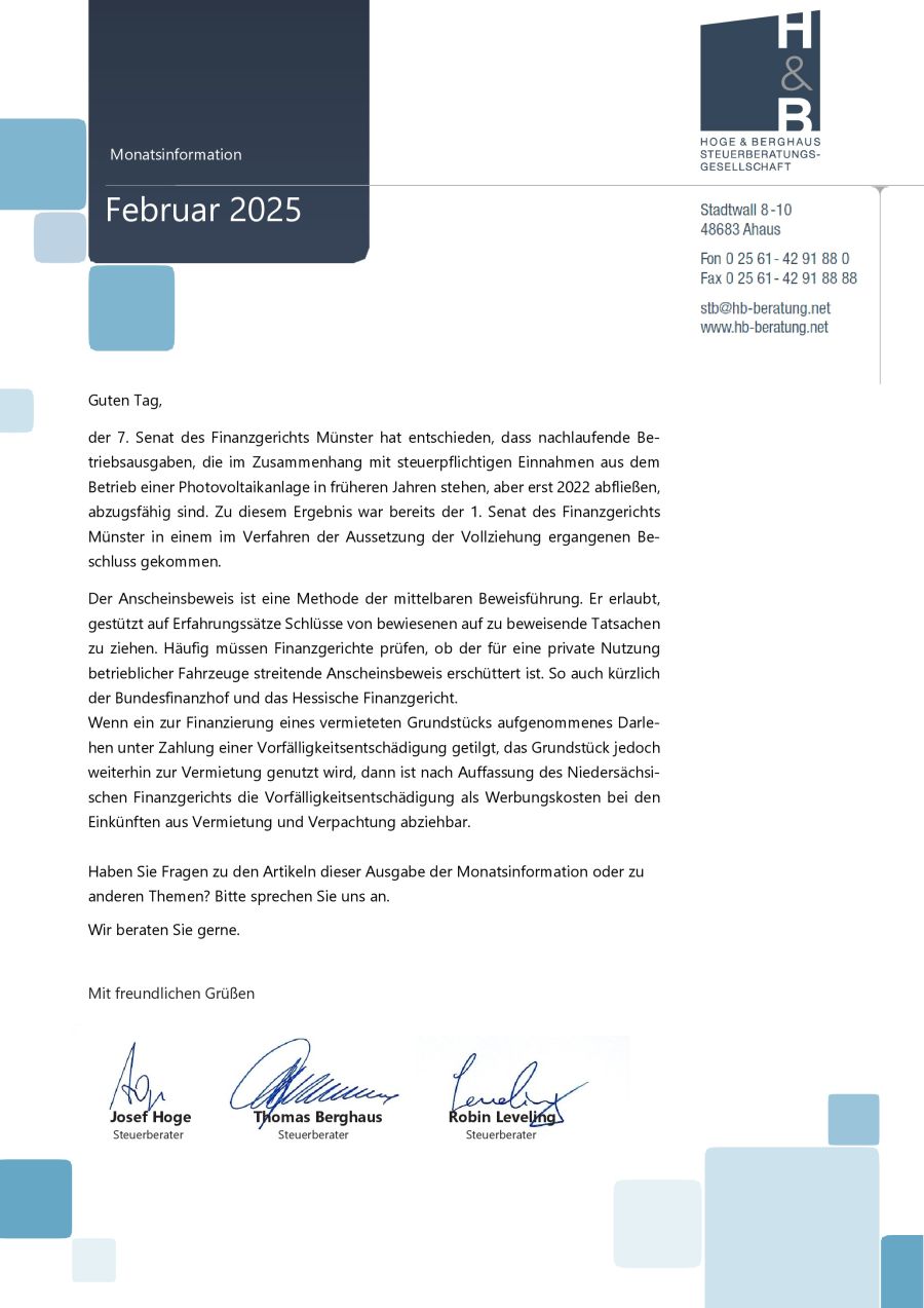 Als Service für unsere Mandanten haben wir aktuelle Informationen zu Steuern, Recht und Wirtschaft in unserer monatlichen Mandanteninformation zusammengestellt. Mit unserer Mandanteninformation bleiben Sie immer auf dem neuesten Stand, insbesondere bei der aktuellen Rechtsprechung, Gesetzesänderungen und anderen für Sie steuerlich relevanten Belangen.