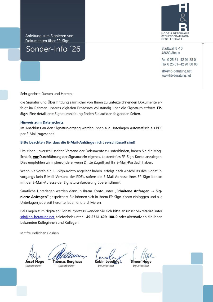 Als Service für unsere Mandanten haben wir aktuelle Informationen zu Steuern, Recht und Wirtschaft in unserer monatlichen Mandanteninformation zusammengestellt. Mit unserer Mandanteninformation bleiben Sie immer auf dem neuesten Stand, insbesondere bei der aktuellen Rechtsprechung, Gesetzesänderungen und anderen für Sie steuerlich relevanten Belangen.